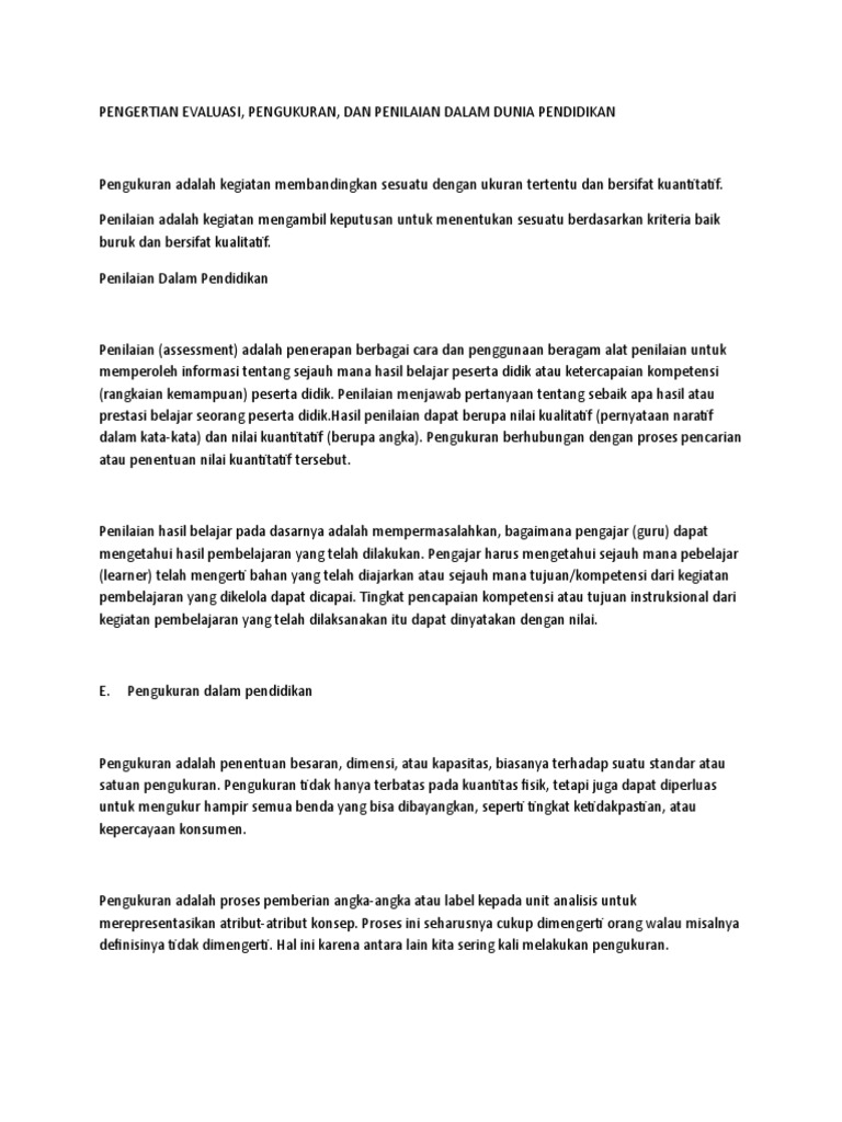 Pengertian evaluasi, penilaian dan pengukuran. Di dalam dunia pendidikan, kata evaluasi sudah tidak asing lagi kita dengar. Apakah jenis yang akan digunakan seperti penilaian. Evaluasi merupakan istilah serapan dalam bahasa indonesia yang berasal dari istilah bahasa inggris evaluation. Artinya ketiga kegiatan tersebut dalam kaitannya dengan proses belajar mengajar tidak dapat dipisahkan satu sama lain dan dalam pelaksanaannya harus dilaksanakan secara berurutan.