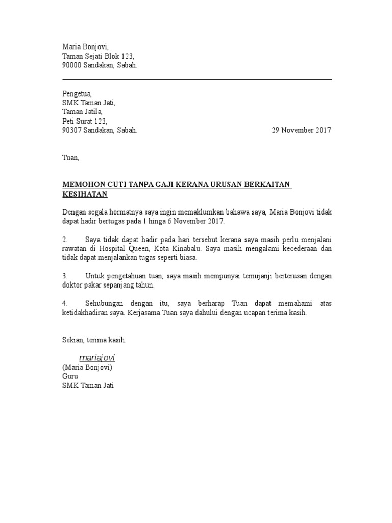 Surat ijin cuti orang tua/wali kepada yth. Keputusan kelulusan cuti permohonan cuti di atas * diluluskan / tidak diluluskan. Mahasiswa yang diijinkan cuti akademik harus memenuhi syarat sebagaiberikut Namun untuk pengajuannya, dibutuhkan sebuah surat resmi. Hari (termasuk hari cuti umum) sebagai cuti tanpa rekod. Demikian surat permohonan beasiswa ini saya buat dengan sebenarnya tanpa rekayasa. Dimaklumkan bahawa terdapat 2 fungsi permohonan cuti tanpa rekod telah ditambah baik dari segi kawalan permohonan berdasarkan kelayakan pemohon dan boleh dimohon melalui hrmis 2.0 dan hrmis klasik. Bersama surat ini saya ingin mengajuakn permohonan cuti selama 3 bulan karena hamil. Contoh surat permohonan izin tidak masuk kerja. Ketua pengarah perkhidmatan awam, datuk seri borhan dolah berkata. Cuti dapat diambil karena beberapa alasan seperti cuti karena sakit, cuti melahirkan atau cuti untuk liburan. Berkaitan itu, saya memohon menggunakan kemudahan cuti tanpa rekod bagi urusan kematian ahli keluarga terdekat selama bahagian iv : Bagi anda yang tidak tahu adanya pekeliling cuti kuarantin ini, berikut dikongsikan secara lebih terperinci tentang kemudahan cuti kuarantin penjawat awam.