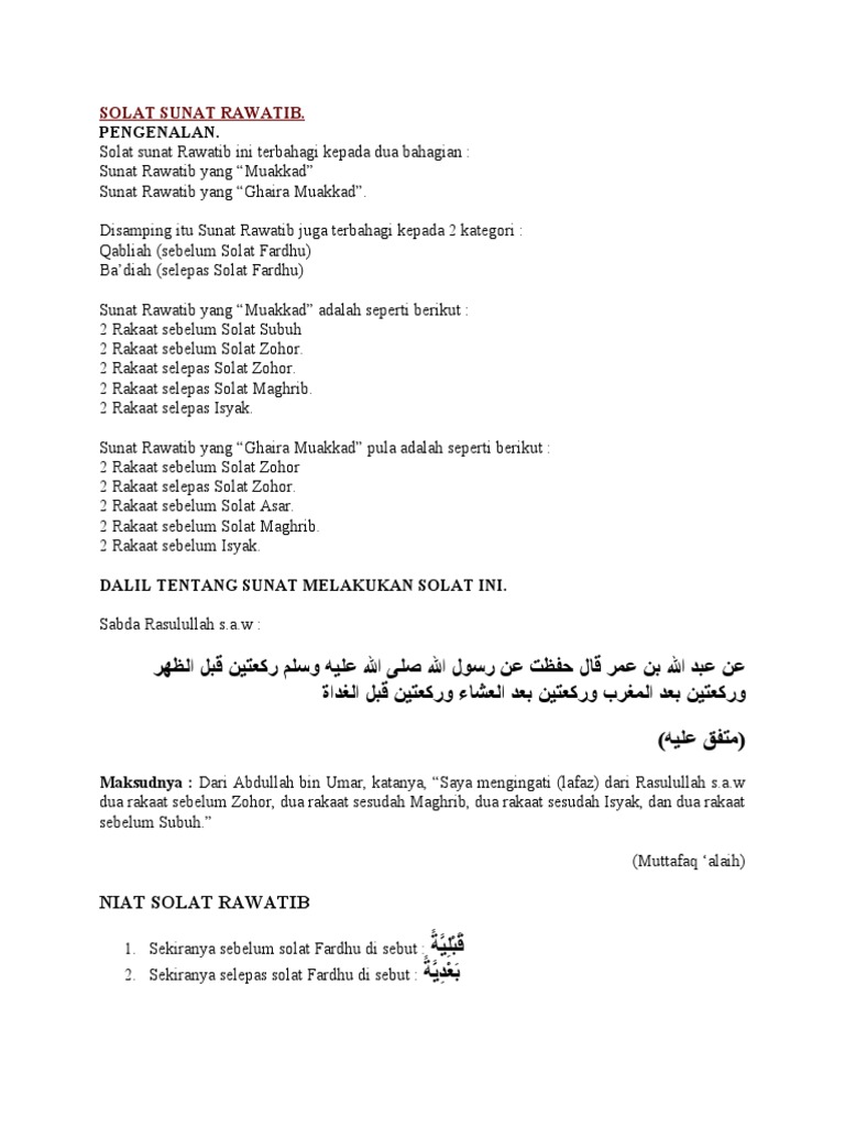 Solat sunat rawatib ialah solat sunat yang dikerjakan sebelum dan selepas solat fardu sebagai pelengkap atau tambahan untuk menampung kekurangan semasa mengerjakan solat fardu. Kelebihan solat sunat sebelum subuh, lebih baik dari dunia dan seisinya. .rawatib qobliyah & ba'diyah sebelum subuh, zuhur & setelah zuhur, maghrib, isya. Solat sunat ini dinamakan solat sunat mutlak kerana ia tidak bersebab (bukan kerana masuk ke masjid, bukan kerana solat sunat sebelum atau selepas solat fardhu, bukan untuk sesuatu hajat dan sebagainya). Solat sunat sebelum solat subuh. Waktu zuhur tiba sesaat setelah istiwa, yakni ketika matahari telah condong ke arah barat. Sunnah nabi dalam solat jumaat. Ia merupakan pelengkap bagi solat wajib yang bertujuan untuk mencari keredaan allah di samping menampung sebarang kekurangan ketika melakukan solat fardhu. أَرْبَعٌ قَبْلَ الظُّهْرِ كَعِدْلِهِنَّ بَعْدَ الْعِشَاءِ ، وَأَرْبَعٌ بَعْدَ الْعِشَاءِ كَعِدْلِهِنَّ مِنْ لَيْلَةِ الْقَدْرِ. Nas solat sunat asar(satu) setelah masuk waktu asar, selepas azan, maka disunatkan kita solat sunat sebelum solat fardhu asar. Solat sunat tahiyatul masjid dan solat sunat rawatib. ( tambahan 2 rakaat yang muakkad). Cuba kita lihat, mukadimah rasulullah saw sebagai pembuka bicara sebelum menganjurkan dan mngajarkan kepada saidina abbas ra berkenaan solat sunat tasbih ini.